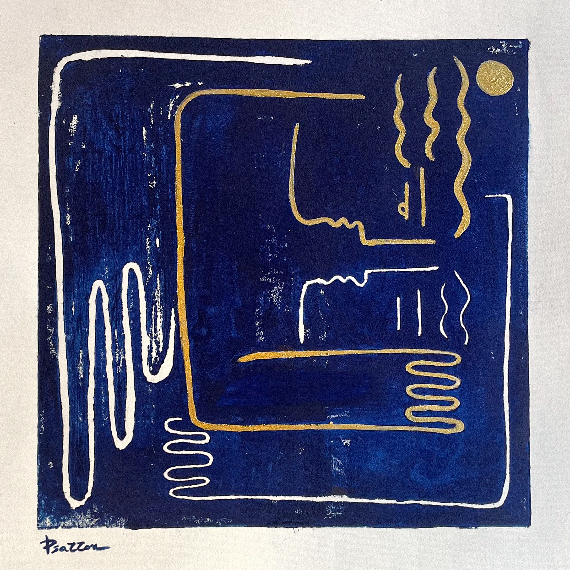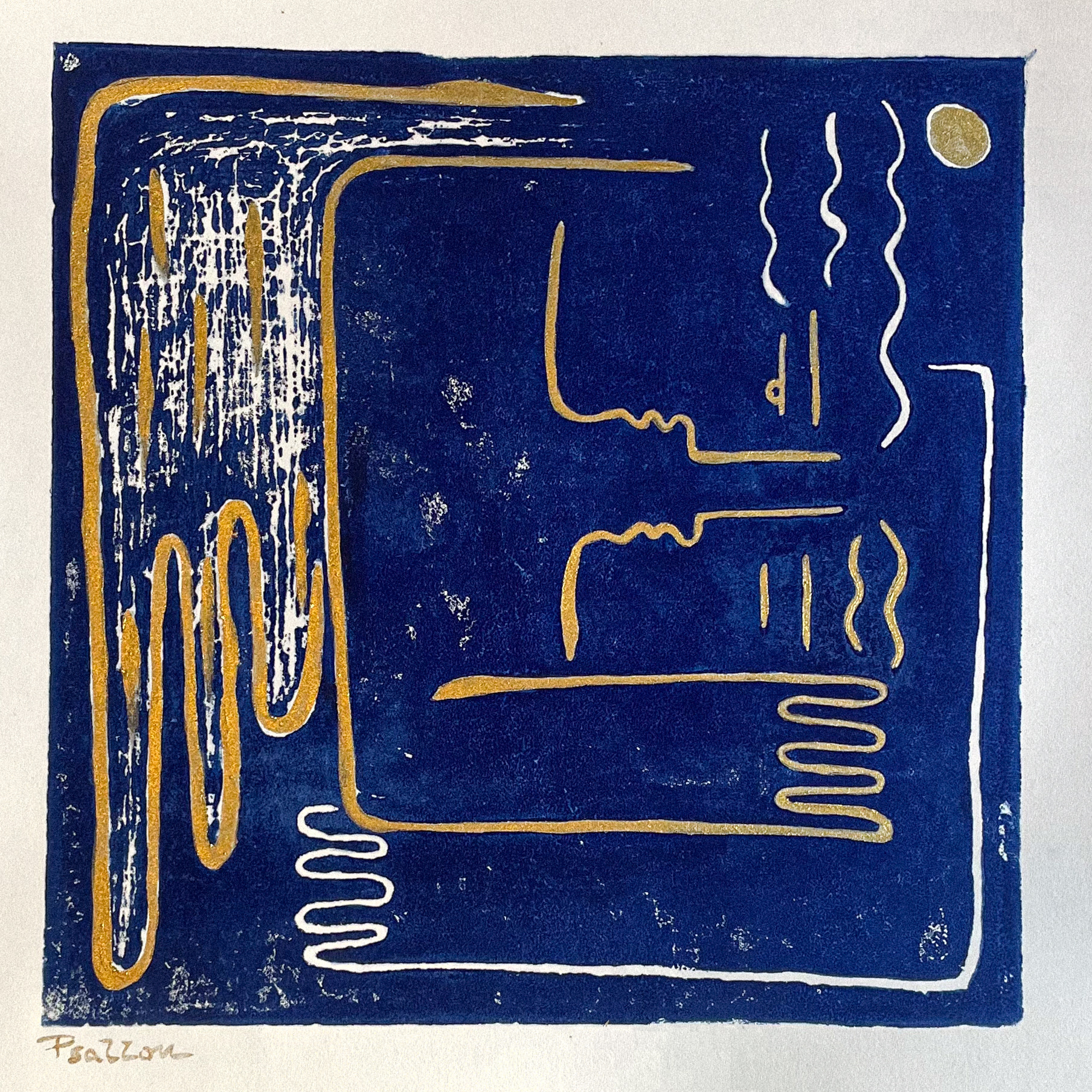 hand-carved into a wooden block, inked, and pressed onto paper, producing a tactile, handmade result.